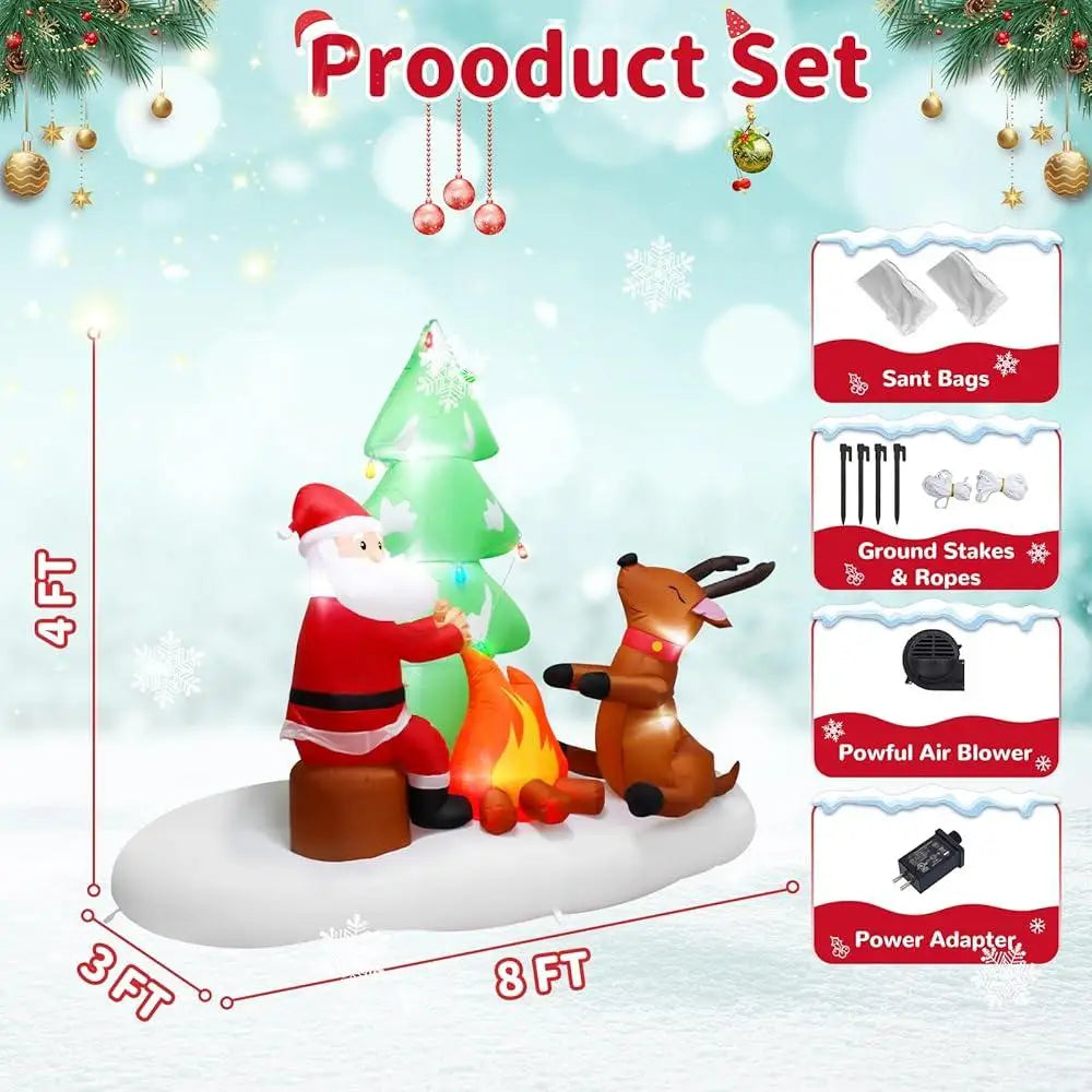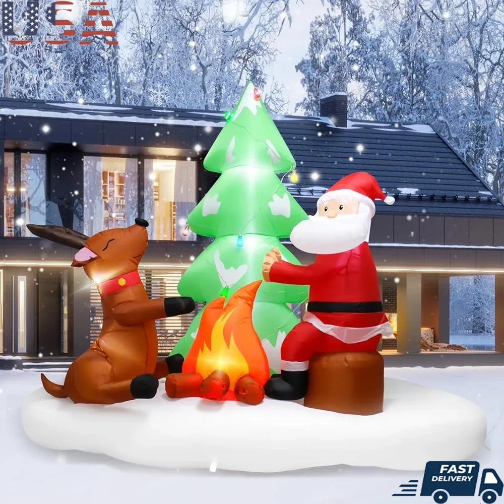 Christmas Decorations: Our 8-foot Christmas Tree Santa Reindeer inflatable decoration is the perfect addition to your outdoor holiday decorations, complete with LED lights to illuminate your yard at night and also to be dramatic at night, as Santa and his adorable reindeer sit around the bonfire to warm up the fire, bringing warmth and joy to your yard    Premium materials: Made of lightweight, weather-resistant polyester, this inflatable Christmas decoration has been carefully designed to withstand all weather elements without fading, ensuring it stays in good condition throughout the festive season    Easy installation and storage: Our Christmas deer blow up tree Santa outdoor decorations are equipped with powerful fans and complete mounting components that make them extremely inflatable, easy to set up and easy to store after the holidays are over, so you can easily decorate your yard, porch or garden for Christmas cheer    Versatile: This inflatable Christmas Santa decoration is perfect for all kinds of outdoor occasions, including lawns, gardens, entrances and Christmas parties, enhancing the festive atmosphere and creating a memorable experience for your family and children    Customer Satisfaction Guarantee: We value quality and support.