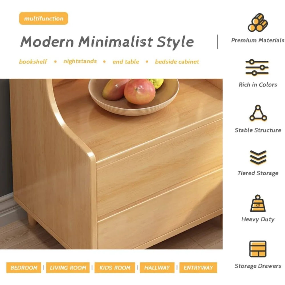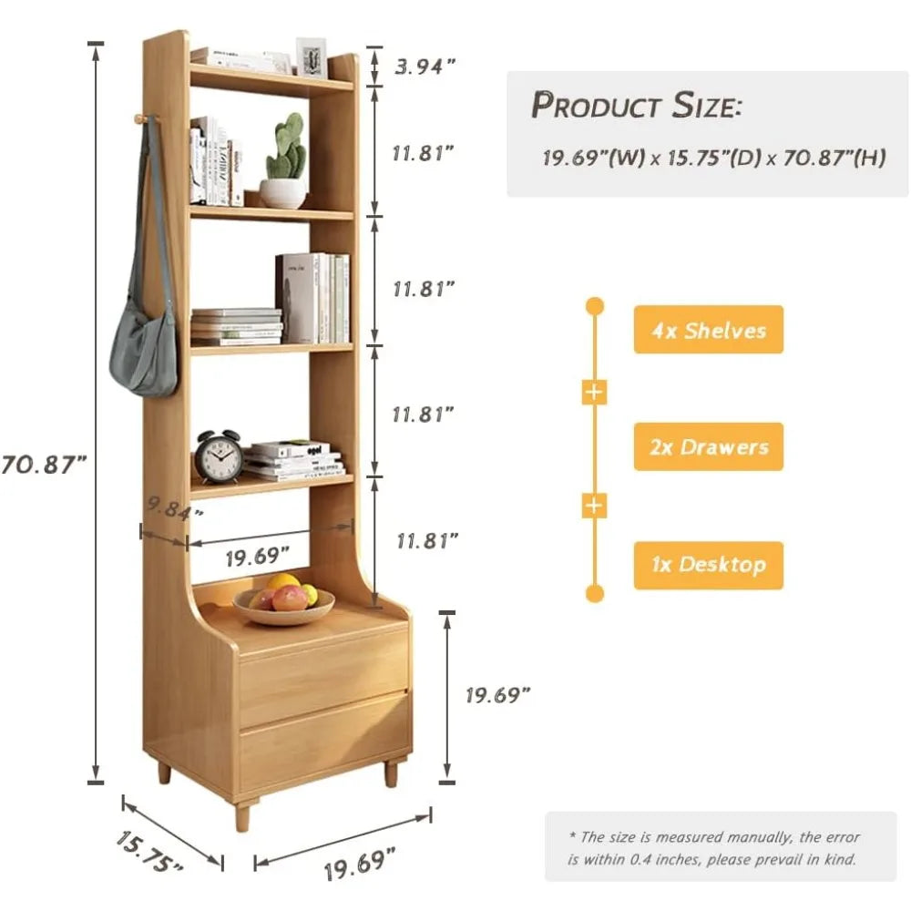Oak Bedside Table Bookshelf - 71" Tall Free Standing Wooden Open Shelf Bookcase with Drawers and 4-Shelves for - HOME