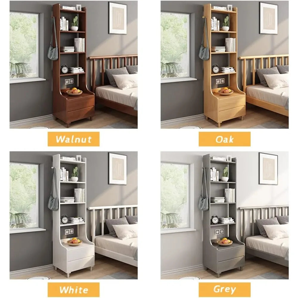 Oak Bedside Table Bookshelf - 71" Tall Free Standing Wooden Open Shelf Bookcase with Drawers and 4-Shelves for Bedroom, Bed Side End Table, Nightstand